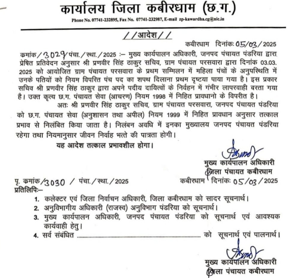 कवर्धा, 05 मार्च 2025। जनपद पंचायत पंडरिया के ग्राम पंचायत परसवारा में नवनिर्वाचित पंच प्रतिनिधियों के प्रथम सम्मिलन में महिला पंचों के अनुपस्थिति में उनके पतियों को नियम विरुद्ध पंच पद का शपथ दिलाये जाने के कारण मुख्य कार्यपालन अधिकारी जिला पंचायत (सीईओ) कबीरधाम अजय कुमार त्रिपाठी द्वारा ग्राम पंचायत परसवारा के सचिव प्रणीवर सिंह ठाकुर को तत्काल प्रभाव से निलंबित किया गया है।