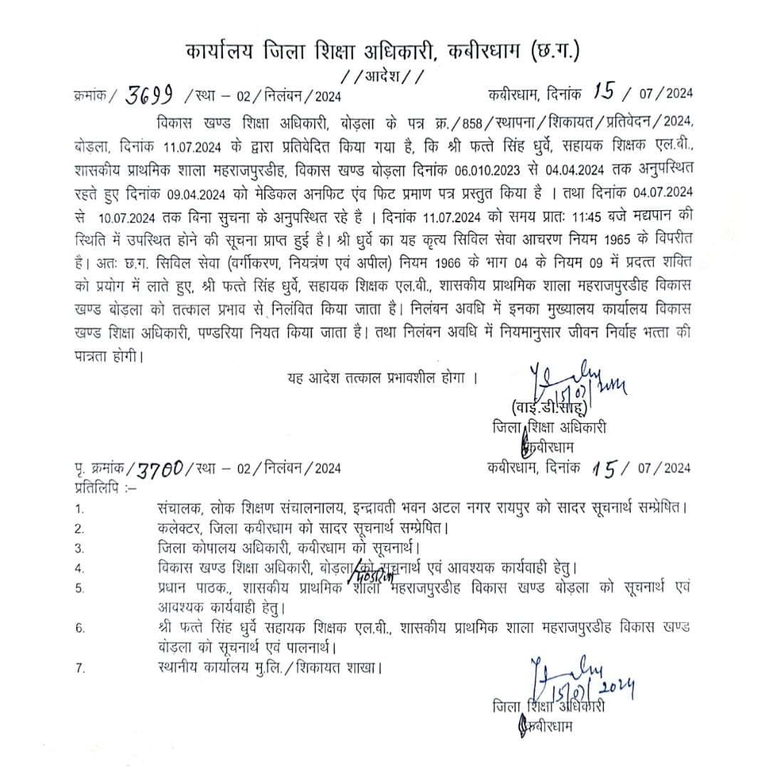 जारी आदेश में बताया गया है कि सहायक शिक्षक एल.बी. फत्ते सिंह धुर्वे 6 अक्टूबर 2023 से 04 अप्रैल 2024 तक अनुपस्थित रहते हुए 09 अप्रैल 2024 को मेडिकल अनफिट एंव फिट प्रमाण पत्र प्रस्तुत किया है और 04 जुलाई 2024 से 10 जुलाई 2024 तक बिना सूचना के अनुपस्थित रहे है। इसके बाद 11 जुलाई 2024 को सुबह 11 बजकर 45 बजे मद्यपान की स्थिति में उपस्थित होने की सूचना प्राप्त हुई है। सहायक शिक्षक एल.बी. फत्ते सिंह धुर्वे का यह कृत्य सिविल सेवा आचरण नियम 1965 के विपरीत है। अतः छ.ग. सिविल सेवा (वर्गीकरण, नियत्रंण एवं अपील) नियम 1966 के भाग 04 के नियम 09 में प्रदत्त शक्ति को प्रयोग में लाते हुए सहायक शिक्षक एल.बी. फत्ते सिंह धुर्वे को तत्काल प्रभाव से निलंबित किया गया है। निलंबन अवधि में इनका मुख्यालय कार्यालय विकासखण्ड शिक्षा अधिकारी, पण्डरिया नियत किया गया है तथा निलंबन अवधि में नियमानुसार जीवन निर्वाह भत्ता की पात्रता होगी।